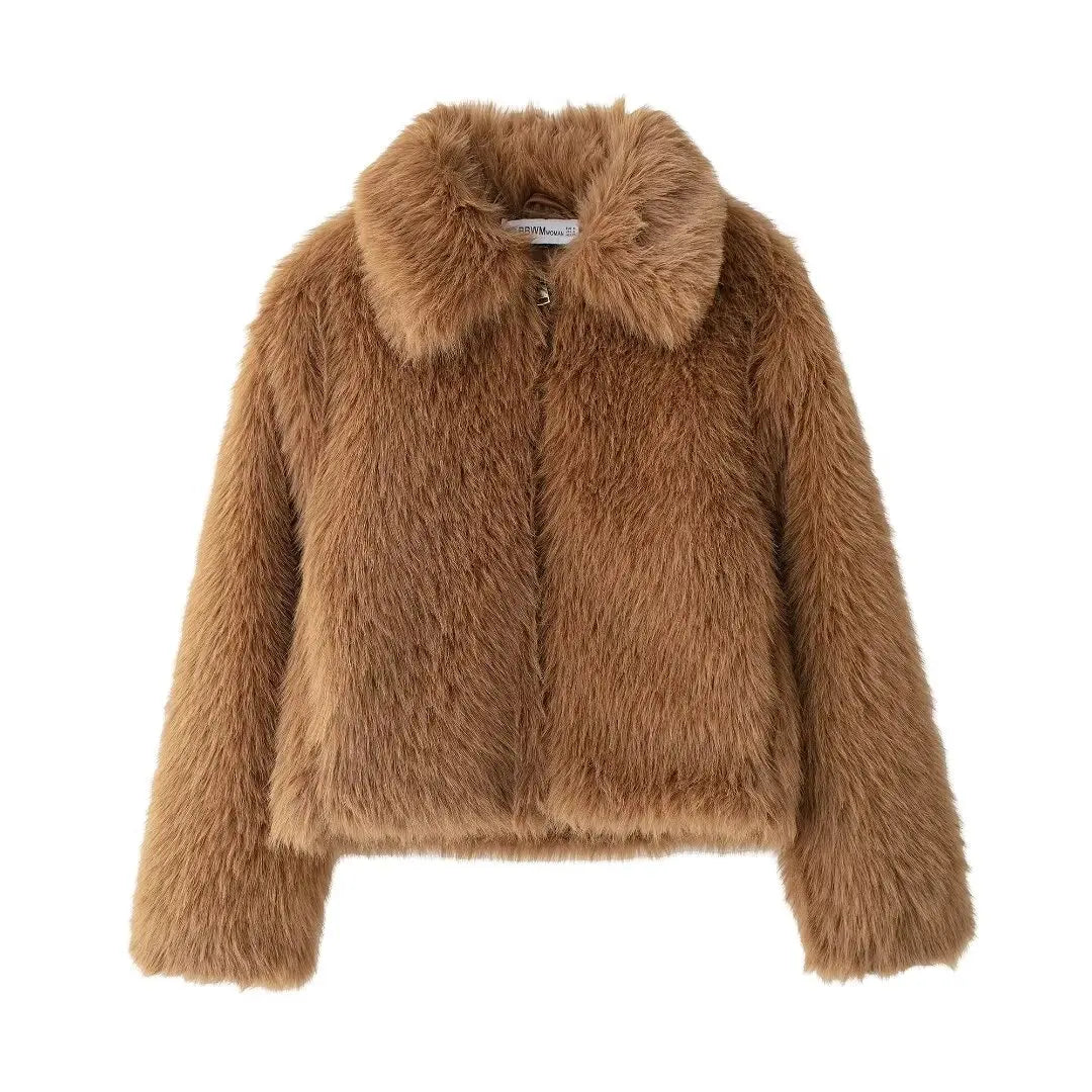 Brown Furry Turn Down Collar Long Sleeve Jacket
