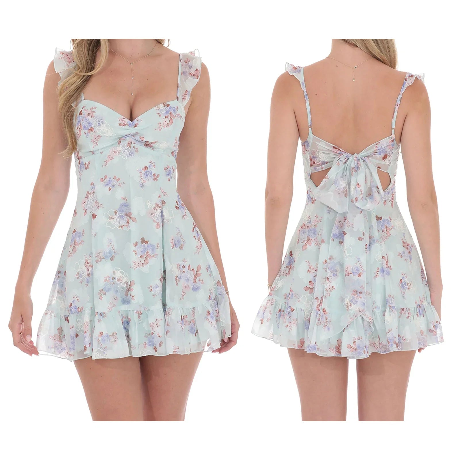 Make a captivating summer statement with our Floral Print Ruffles Straps Mini Dress. This vibrant piece is designed for the modern trendsetter. featuring a bold floral print and delicate ruffle details that add a touch of whimsy. The chic square collar and alluring open back create a dynamic silhouette. perfect for sun-drenched days and balmy evenings. Crafted from non-stretch polyester with a smooth synthetic fiber composition. it offers a slim fit and a flattering A-line profile that hits above the knee. This dress is your go-to for effortless style and instant impact this season.