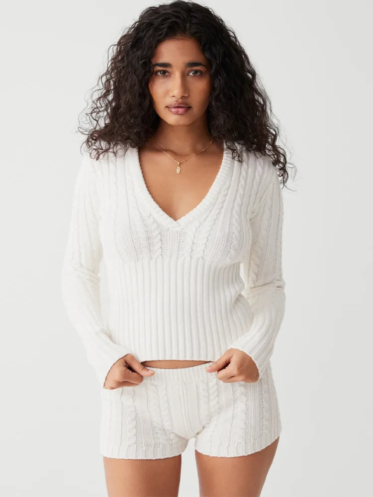 Long Sleeve Knitted V-Neck Hooded Sweater And Shorts Set