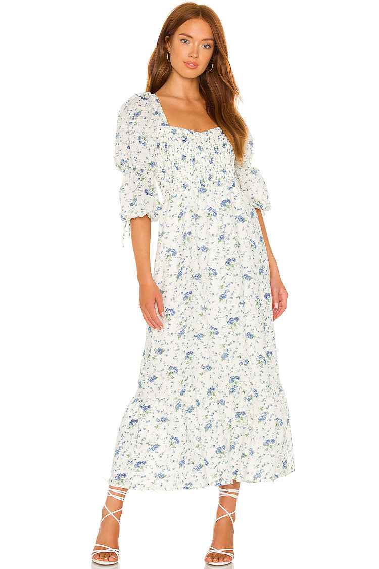 Embrace the romance in the air with fresh printed dresses for women. You look fantastic in this puff sleeve smocked A-line floral printed midi dress. Designed with a scoop neckline and a square back. a shirred bodice in a pull-on styling. elbow puffy sleeves with tied cuffs. a fit and flare silhouette in clean and pure mini flowers all-over. a mix of polyester. and a tea length dress cut with a ruffle hem. this fabulous summer dress in our boutique is ideal for your next garden party. Team yours up with white heels to complete a French style outfit.